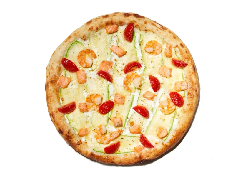 Вершки, сир Моцарела, мариновані слайси кабачку/цукіні, тигрова креветка, лосось, помідори чері, лимоний дрессінг, спеції