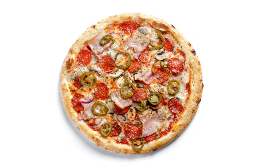 Бекон, салямі пепероні, цибуля, печериці, перець халапеньо, сир моцарела, піца соус