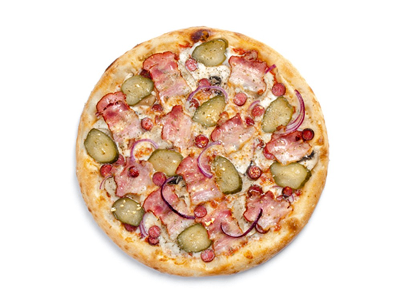 Бекон, ковбаски мисливські, печериці, огірок маринований, цибуля, часник, піца соус, сир моцарела, спеції