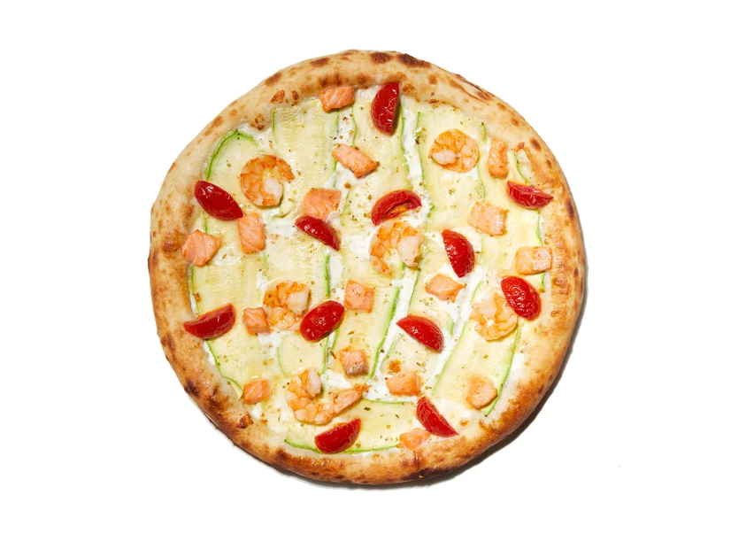 Вершки, сир Моцарела, мариновані слайси кабачку/цукіні, тигрова креветка, лосось, помідори чері, лимоний дрессінг, спеції
