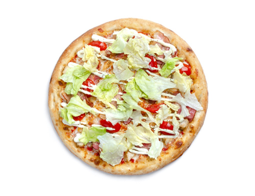 Куряче філе, бекон, томати чері, салат айсберг, соус цезар (часниковий), піца соус, сир моцарела, спеції (листя салату, від жару піци, можуть втратити хрусткість під час доставки)