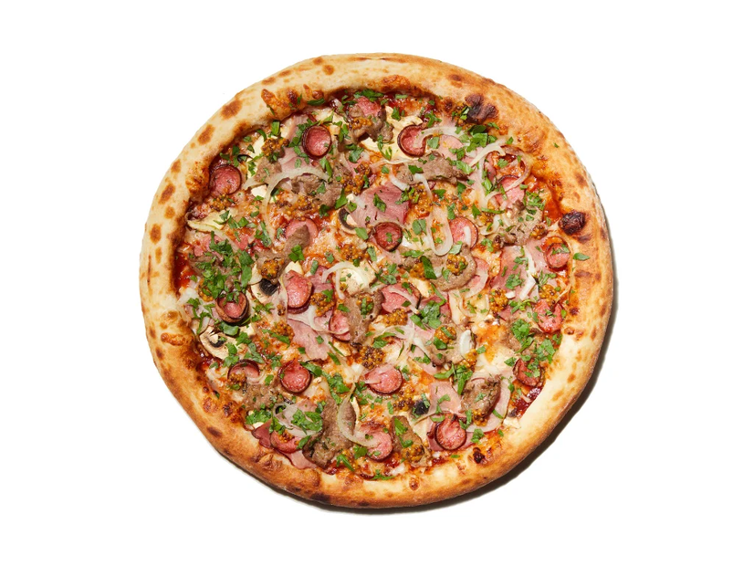 Соус барбекю, сир моцарела, маринована цибуля, гриби, мисливські ковбаски, шинка, маринована телятина, французька гірчиця, зелень