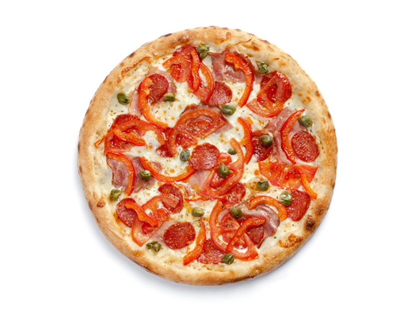 Салямі пепероні, шинка, томати, болгарський перець, каперси, соус вершковий, сир моцарела, спеції