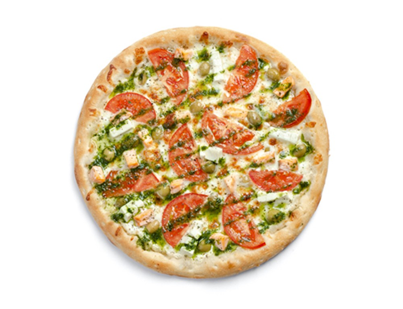 Лосось, томати, оливки, сир фета, соус песто, вершковий соус, сир моцарела, спеції