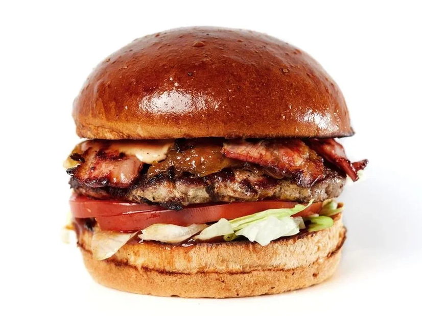 Булочка бріош, котлета із яловичини, смажений бекон, цибуля конфі, салат айсберг, томати, бургерний соус, соус барбекю