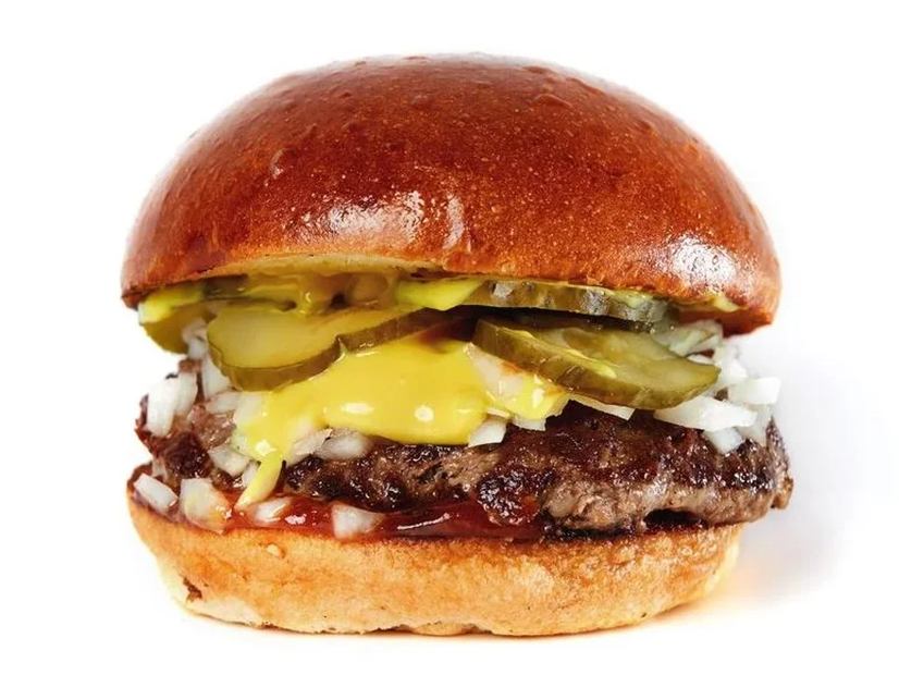 Булочка бріош, котлета із яловичини, цибуля cвіжа, маринований огірок, гірчиця, кетчуп