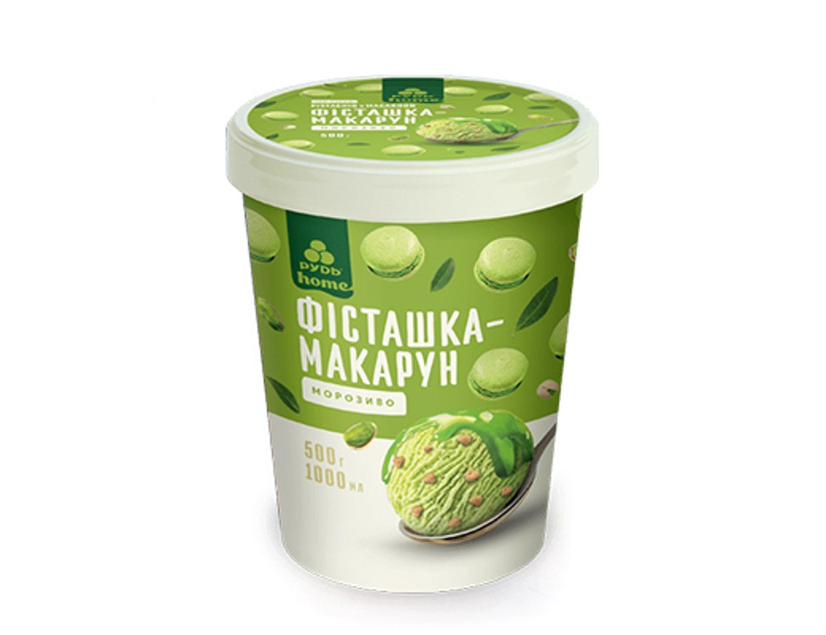 Розкішне фісташкове морозиво з ніжним мигдалевим печивом «Макарун» та запашною фісташковою поливкою.